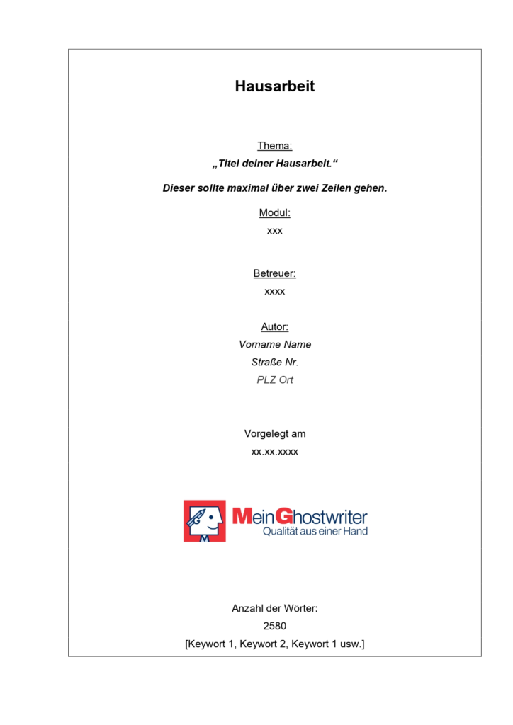 - Titel der Arbeit: Der Titel sollte präzise den Inhalt Ihrer Hausarbeit widerspiegeln, ohne zu lang oder zu komplex zu sein.