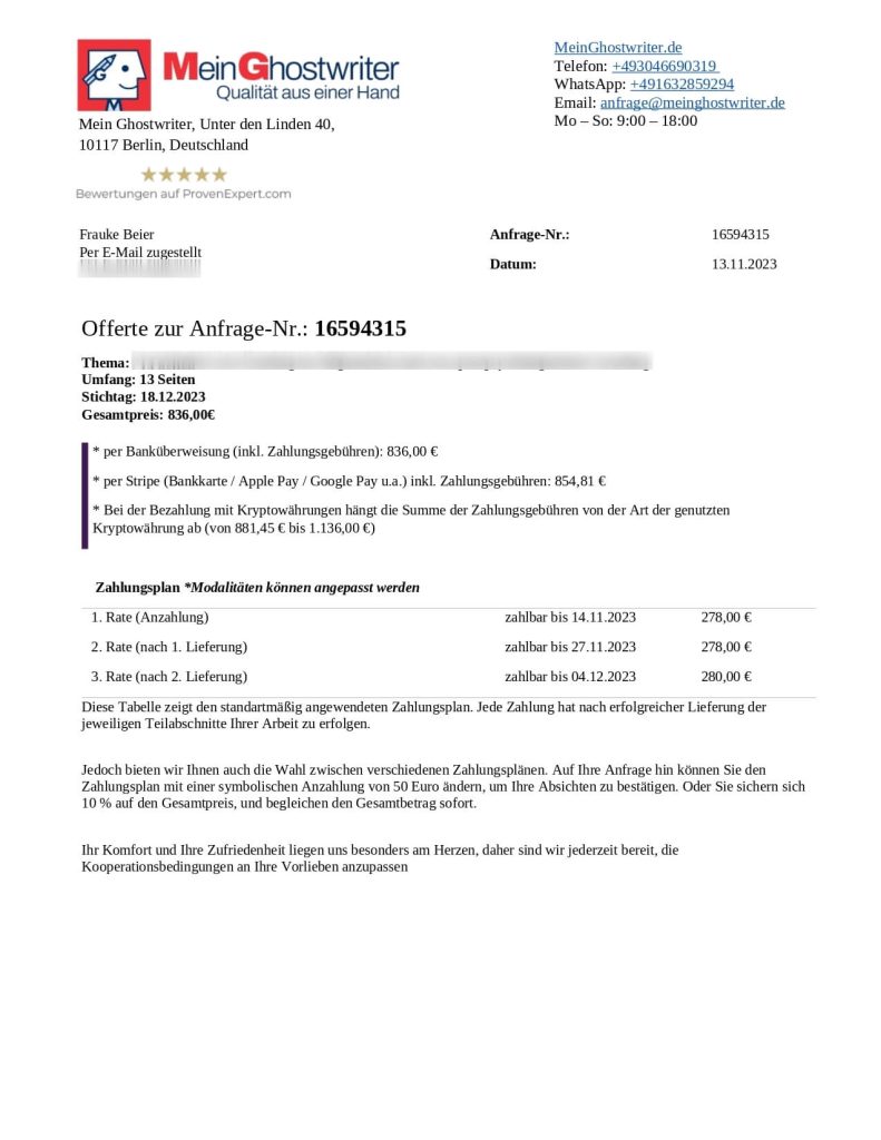 Bei Mein Ghostwriter legen wir großen Wert auf klare und faire Preise. Jedes Projekt hat seine eigenen Anforderungen, daher bieten wir individuelle und flexible Lösungen. Ob Bachelorarbeit, Diplomarbeit oder Hausarbeit – unsere Dienstleistungen decken verschiedenste Bereiche ab und unterstützen Sie bei der Erreichung Ihrer akademischen Ziele. Wir wissen, dass der akademische Druck oft sehr hoch ist, und wir sind hier, um Ihnen zu helfen, Ihre Ziele mit Leichtigkeit zu erreichen.