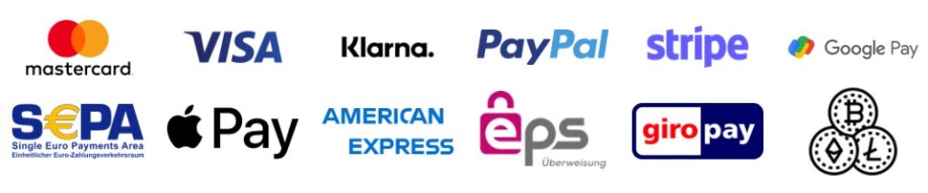 Egal für welche Zahlungsmethode Sie sich entscheiden, sie bleiben anonym. Über Ihre Zahlung kann nicht zurückverfolgt werden, wer den Auftrag erteilt hat. Die Standards der GDPR (General Data Protection Regulation) werden von uns berücksichtigt. Darüber hinaus können Sie in Raten zahlen oder den gesamten Betrag auf einmal begleichen. Wir akzeptieren alle gängigen Zahlungsmethoden. Sollte die von Ihnen präferierte Zahlungsmethode nicht gelistet sein, wenden Sie sich bitte an den Kundenservice.